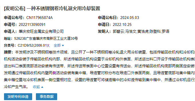 5月3日,肇慶宏旺金屬實(shí)業(yè)有限公司成功申請(qǐng)一項(xiàng)名為“一種不銹鋼鋼卷冷軋退火用冷卻裝置”專利,申請(qǐng)公布號(hào)CN117965874A,申請(qǐng)日期為2022年10月25日。
